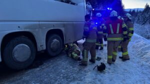 Nach einem missglückten Ausweichmanöver war ein Reisebus von der Fahrbahn abgekommen, in den Straßengraben geraten und dort in Schräglage zum Stillstand gekommen.