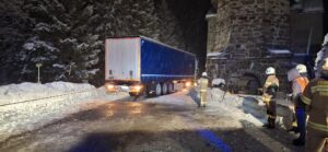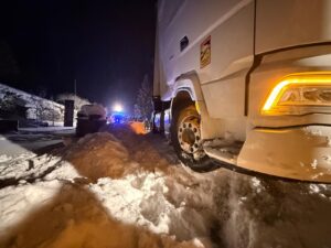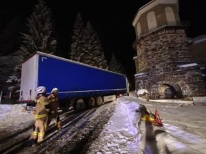 Am Einsatzort wurde eine Sattelzugmaschine vorgefunden, die sich aufgrund der winterlichen Fahrbahnverhältnisse im Schnee festgefahren hatte.